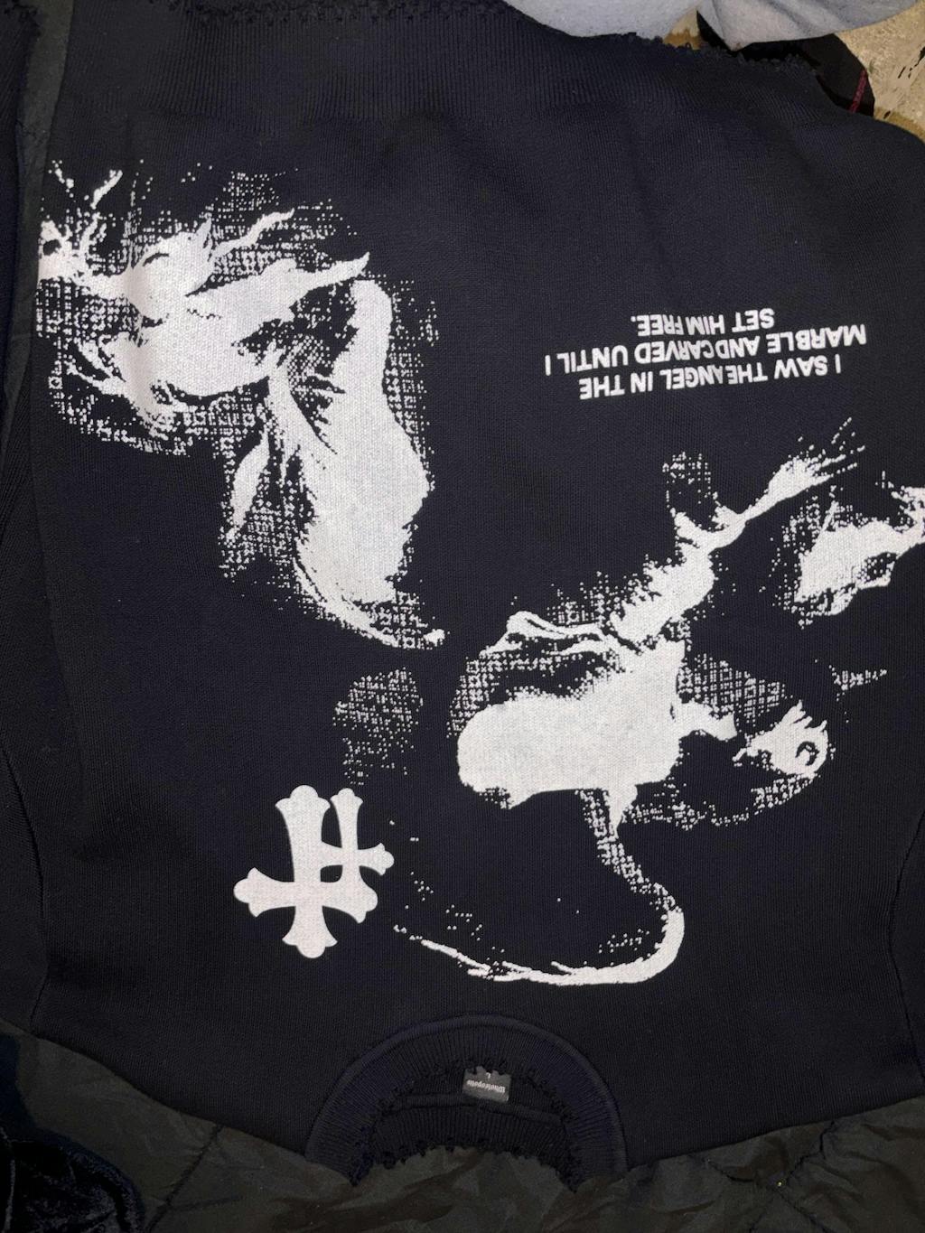 Stay grounded in faith with this sweater, featuring a striking angelic design and bold cross detail. A reminder that true strength comes from above.